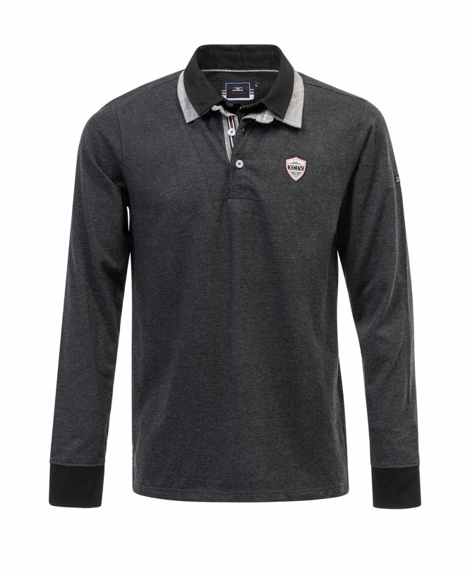 Sweat noir chiné pour homme. Col polo. Visuel exclusif. Ecusson sur la manche gauche et écussion sur le torse coté coeur. Jersey lourd 60% coton 40% polyester 310 gsm. Ce polo bien chaud vous permettra de passer l’hiver sereinement.